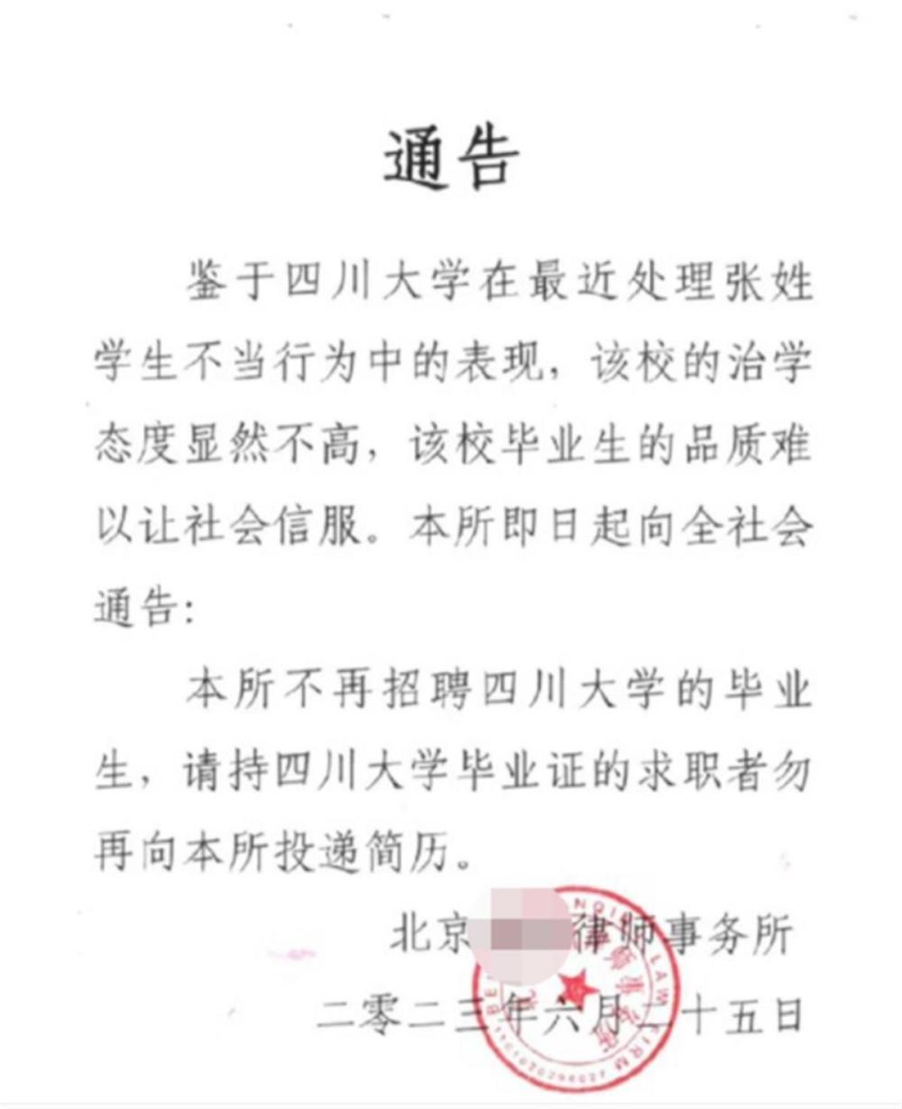 该律所的通告称,“鉴于四川大学在最近处理张姓学生不当行为中的表现,该校的治学态度显然不高,该校毕业生的品质难以让社会信服。本所即日起向全社会通告:本所不再招聘四川大学的毕业生,请持四川大学毕业证的求职者勿再向本所投递简历。”