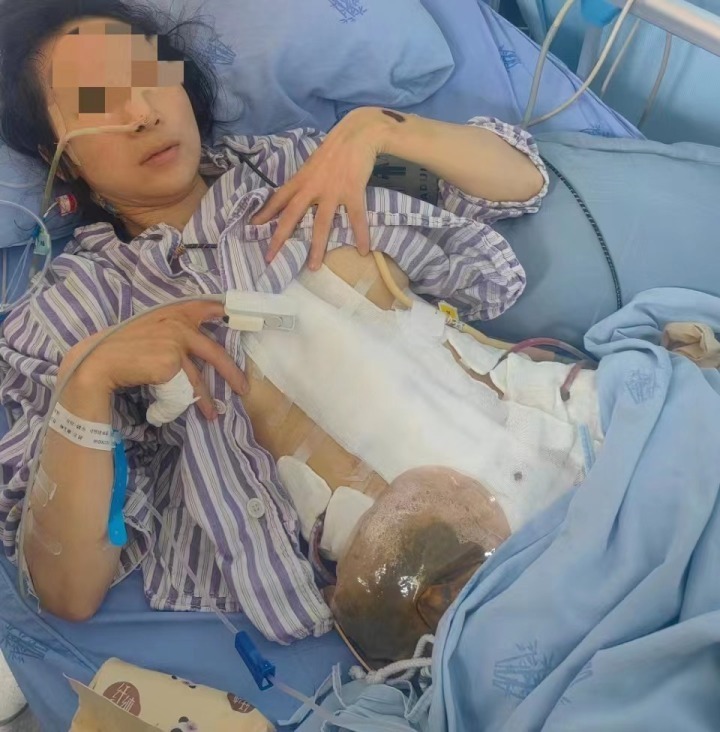 目前,谢女士已住院两个月,三根肋骨骨折,十二指肠被污染,小肠梗阻,内脏受到不同程度损伤,腹部到胸部留下一道长长的手术刀口。谢女士老公贺某已经被刑事拘留。