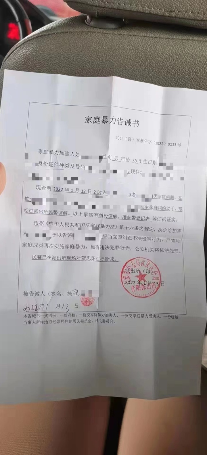 2022年1月13日,警方出具了一次家庭暴力告诫书,但状况并没有改善。谢女士告诉潮新闻记者,其他几次接警均以调解为主。她也曾拨打12345求助,电话转接给武侯区妇联后,由于她当时为了躲避丈夫,躲到了朋友家里,不在家中,当时妇联未能介入调解。