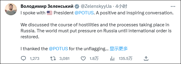 与拜登通话后,乌总统泽连斯基则亦在个人推特发文称他同拜登的谈话“积极且鼓舞人心”,双方讨论了“敌对行动的进程以及俄罗斯正在发生的事件”,他称“国际社会必须向俄罗斯施压,直到国际秩序得到恢复”。