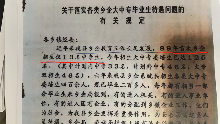 除此之外,伍金根向记者提供了南陵县乡镇企业局和劳动局在1994年发布的文件,其中有写:南陵县于1989年才首次乡企招生。“如果我们班是乡企班,那就证明南陵县早在1988年就已经开始招收乡企中专生,这份规定存在事实性错误”。