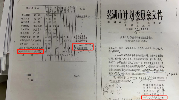 伍金根和同学就该情况向南陵县相关部门反映后,工作人员向他们出示了1988年7月30日芜湖市计划委员会关于转发《关于举办乡镇企业中专班有关问题的通知》的文件。附件内容显示,南陵县职高工民建筑专业为乡镇企业中专班。同时,该份文件要求抄送至各县县委办。