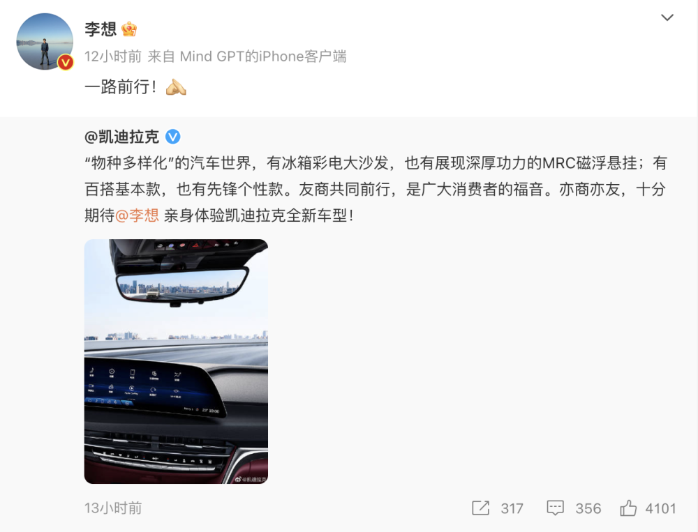 随后,理想汽车CEO李想与凯迪拉克官方进行互动表示,一路前行。针对这一热门事件,腾讯汽车第一时间向理想汽车和凯迪拉克汽车公关求证,理想汽车公关表示不知具体情况。