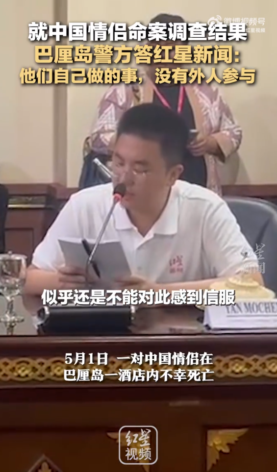 警方负责人回答红星新闻记者针对中国情侣案提问时表示,“通过酒店的监控以及见证人(证词), 我们得出的结论就是:这是他们自己做的事情,没有外人参与,属于自杀案件。”