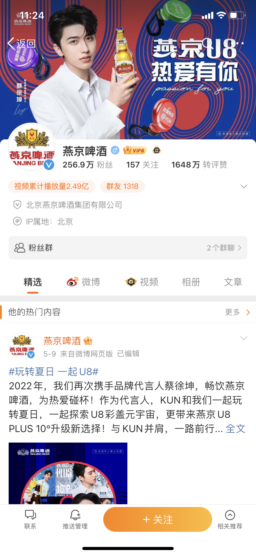 据了解,早在2021年5月,燕京啤酒官宣蔡徐坤成品牌代言人,2022年又官宣蔡徐坤为U8创意总监与代言人,如今,U8已成为燕京啤酒的一大核心单品。财报显示,2023年1-3月,燕京啤酒该公司营收35.26亿元,同比增长13.74%,净利6456.38万元,同比激增7373.18%。