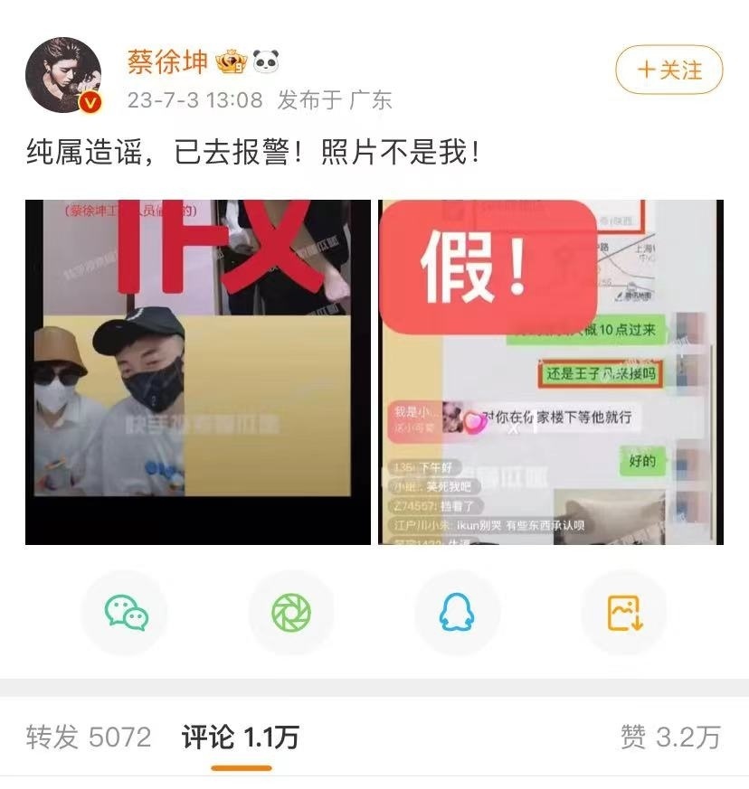 近日,蔡徐坤私生活事件持续发酵。7月3日午间,娱乐博主“懂瓜呱”“超能摄影阳阳”在快手直播间中称蔡徐坤曾与未成年粉丝发生关系,并发布了疑似两人的亲密照、聊天记录等图片。随后蔡徐坤立即发布微博回应称,“纯属造谣,已报警,照片不是我!”