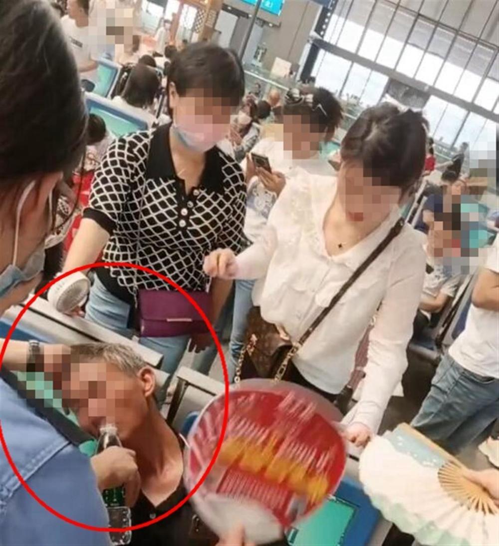 现场视频显示,候车室内,一名男子表情痛苦地坐在椅子上,闭着眼睛向一侧倾斜。多名工作人员围在男子身前,有人用手托着他头部,还有人正尝试给他喝水,周围多人用扇子不停为其扇风降温。
