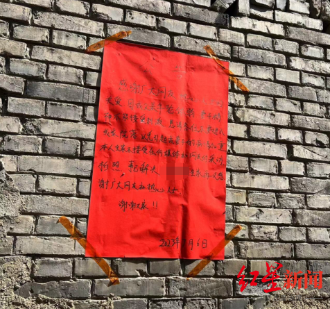 受欺凌男孩的家是一间坐落在村中小路里的老房子。彼时,其家外的小路口上堵满了人,孩子的姑姑正在人群中接受着爱心人士的探望与慰问。在其一旁的墙上贴着一张红底告示,上面写着因担心其父亲与妻子的身体和精神,谢绝网友与爱心人士进家探望的好意。