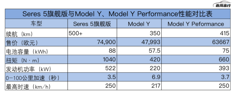 Seres 5顶配性与Model Y和Model Y Performance性能对比,信息来源于公开资料,连线出行制表
