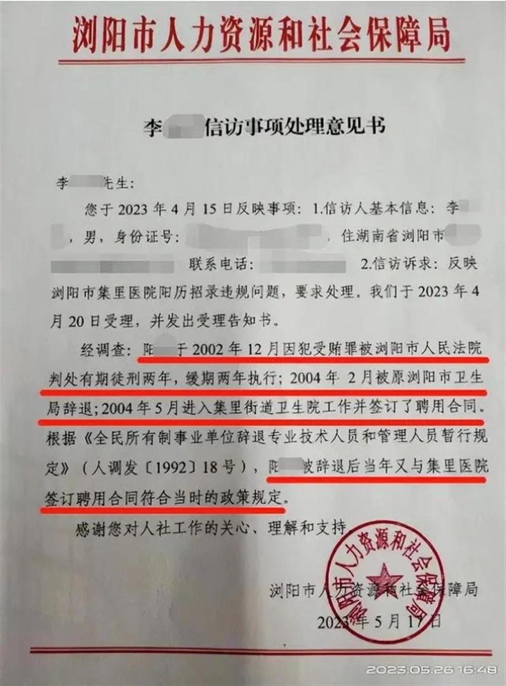 而浏阳市人力资源和社会保障局2023年5月17日对举报人出具的《信访事件处理意见书》称,阳某被辞退后,当年又与集里医院签订聘用合同,符合当时的政策规定。这回复可以说是完全没有回到点子上。