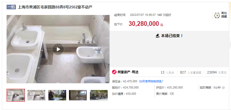 高性价比是促使买家哄抢的主要原因,尽管建成已有十余年,但华润外滩九里在上海豪宅市场依然是排的上号的存在,颇受购房者青睐。2020年至今,阿里法拍平台先后上架了6套该小区房源,其中有5套竞拍均超百轮,最激烈的一次有8人报名,出价高达884次。