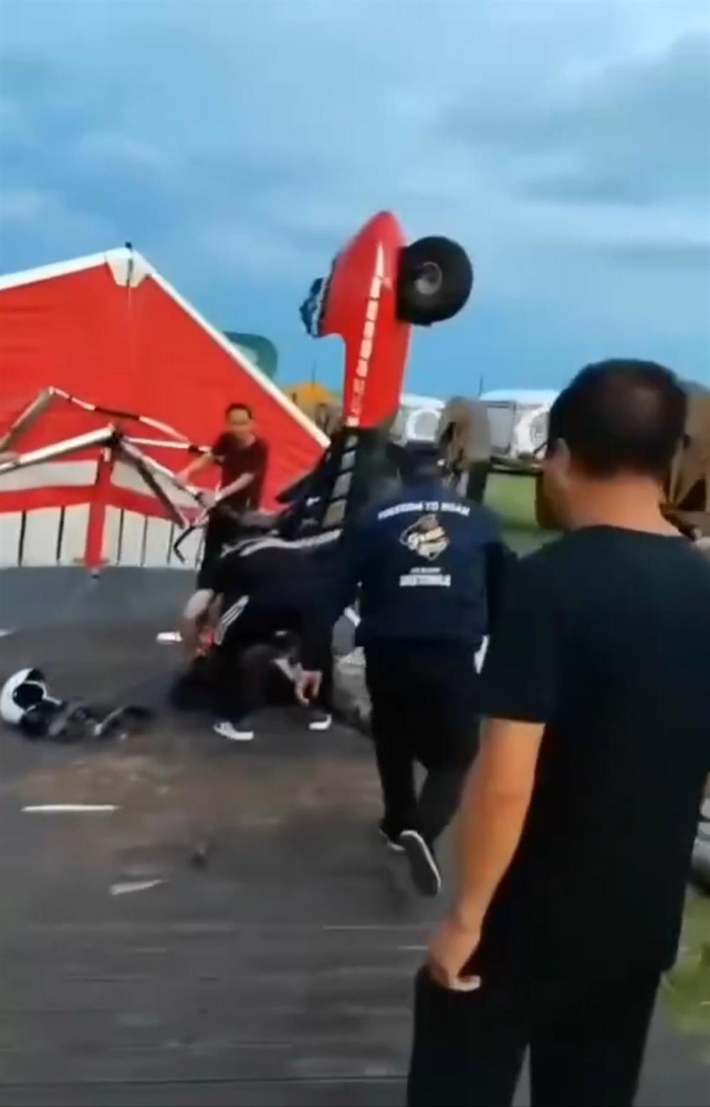 视频显示,一架三角翼飞机坠落地面,两人躺在地上昏迷,周围有人在救助。飞机坠落的地方位于一片草原,周围还有蒙古包。