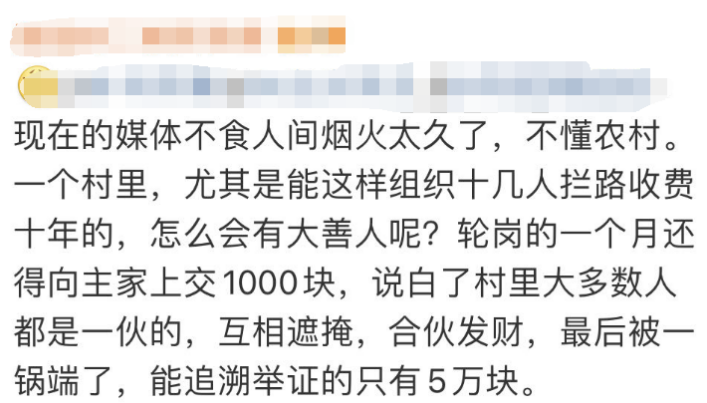提炼一下大意是,一种说法认为村里人信不过,他们是一伙的,他们互相遮掩,村民才是“全员恶人”。
