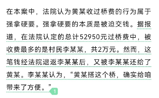 这笔费用中,村民李某被收费最多,共2万元。这笔钱经法院退返给了李某,又被他还给了黄某。李某说:“这座桥确实给咱带来了方便。”