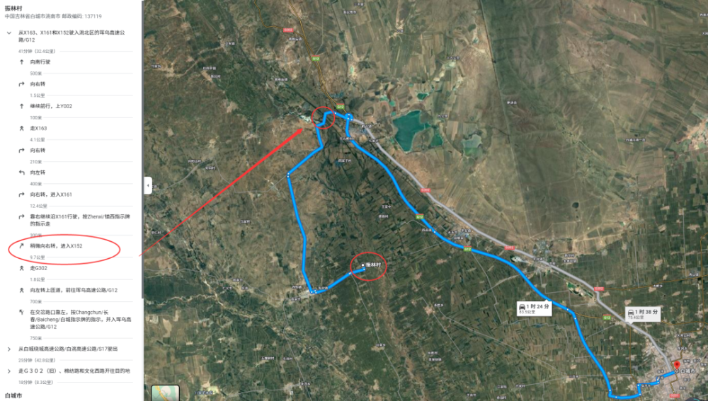 没有浮桥,振林村到白城市的地图距离是83公里,绕了一个大圈。