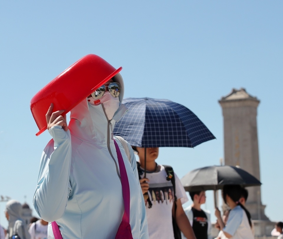 2023年7月9日,北京,游客冒高温外出游玩,采取各种措施遮阳防晒。(视觉中国/图)