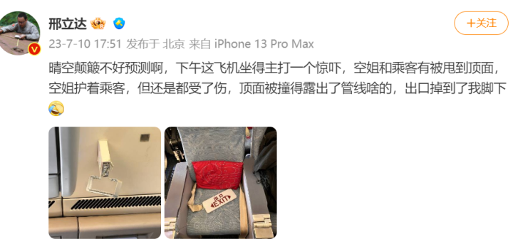 博主@邢立达 称:空姐和乘客有被甩到顶面,空姐护着乘客,但还是都受了伤,顶面被撞得露出了管线啥的,出口掉到了我脚下。