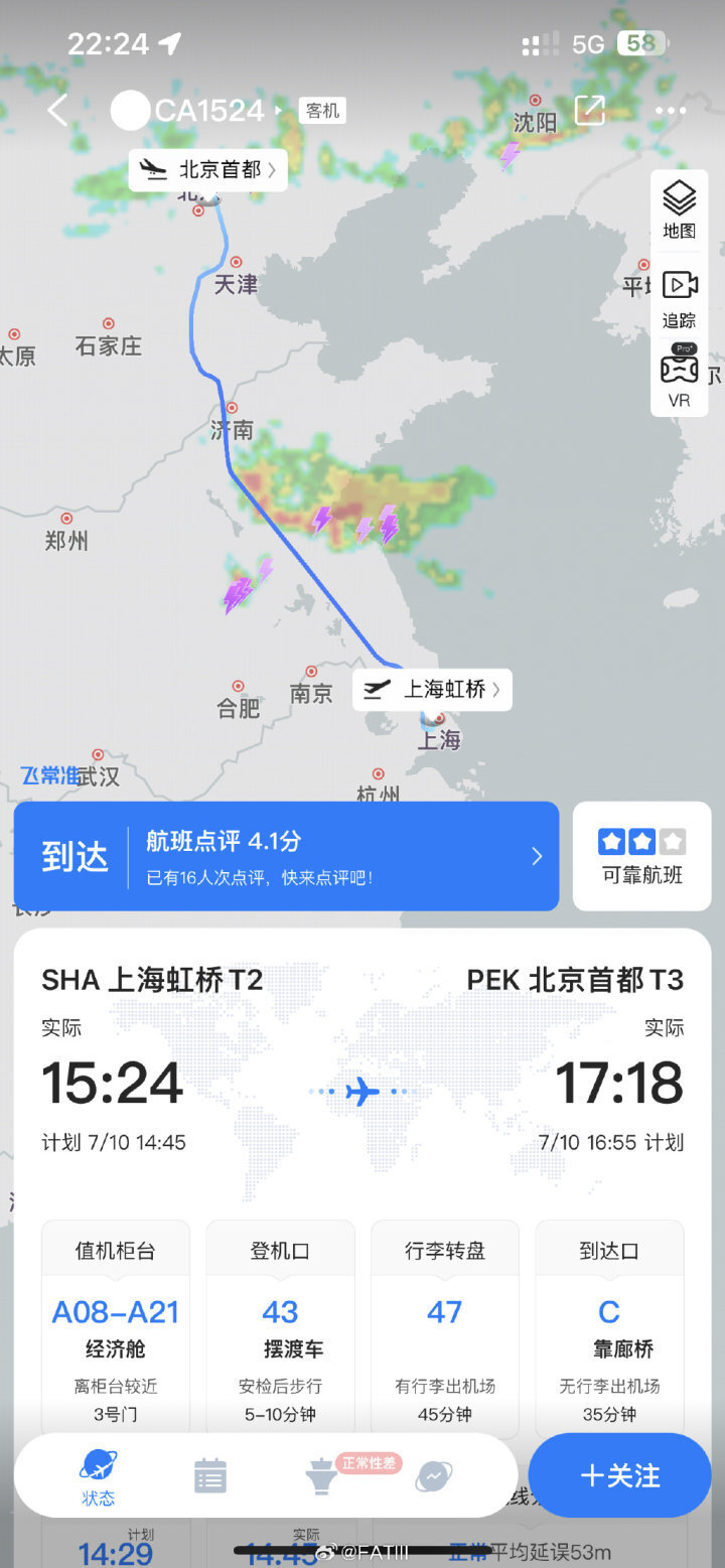 今天上海回北京,华东雷雨,改签了1524,是因为只有它顺利的落到了上海,剩下的备降到了杭州等地。飞行前半段还比较平稳,在最后30-40分钟左右,大家都来来回回上洗手间,突然一个下坠,大家吓一跳就赶紧坐好了,后面也无比庆幸有这个时间窗口,因为在这极短的间隔,又一次猛烈的下坠,把正在帮助乘客归位的空姐,乘客,都抛到了天花板,安全出口的告示砸碎了,天花板踢开了,抛上去的人都挂彩了,乘客们扎扎实实吓了一跳。这里夸夸国航的空姐,她们自然也是紧张,但第一时间保护了上抛的乘客,抱着一起上去了……而后又对受伤乘客展开救护,专业且冷静,夸夸。