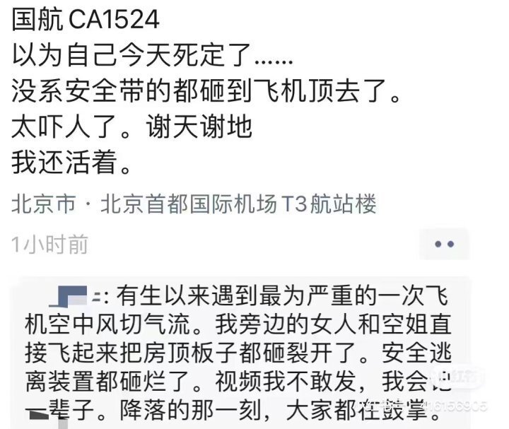 今天多位网友发帖称,上海飞往北京的CA1524航班,在空中遭遇了严重颠簸。