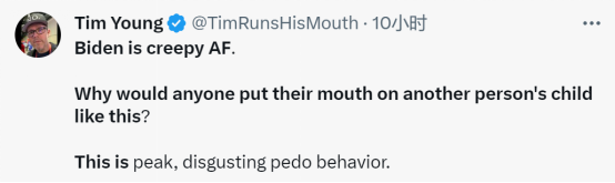 美国喜剧演员蒂姆·杨表示,“拜登真令人感到毛骨悚然。为什么会有人对别人的孩子动嘴?这是最令人厌恶的恋童癖行为。”