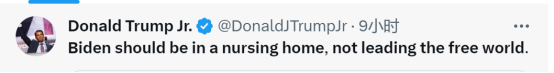 美国前总统特朗普的儿子小唐纳德·特朗普也在推特上回应这段视频称,“拜登应该待在养老院,而不是领导自由世界。”
