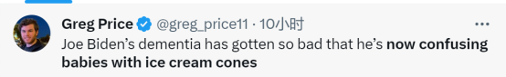 报道说,共和党人格雷格·普莱斯还开玩笑讽刺说,“乔·拜登的痴呆症已经严重到他现在把婴儿和冰淇淋甜筒搞混了”。