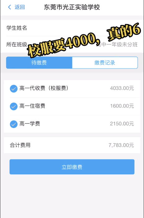 该网友发布的图片显示,东莞市光正实验中学的高一新生待缴费明细中,涵盖有三项,高一住宿费1600元,高一学费2150元,最高的一项是高一代收费(校服费)4033元,合计7783元。