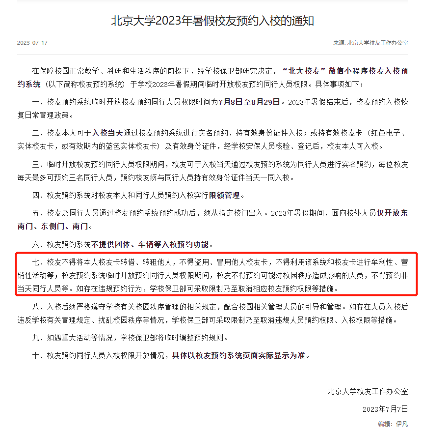 7月7日,北京大学保卫部发布通报称:7月5日,工作发现,一个名为“狼爸部落”的校外研学团队,通过联系校内人员、借用账号在树洞平台发布预约求助信息等方式拆分预约,由多名校内师生预约入校。通报称,将关闭组织人员的预约入校系统使用权限,不再恢复;暂停该团队校内预约人员的预约入校系统使用权限2个月。
