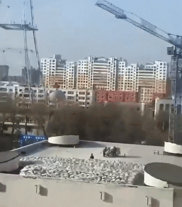 事故发生后甚至有网友晒出工人在体育馆屋顶堆货的视频,树秃着,工人穿长衣,显然不是夏季。