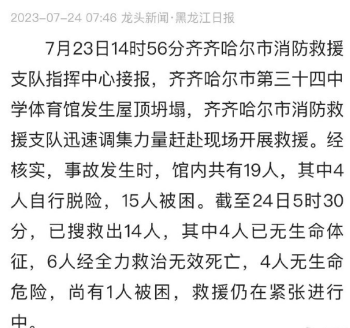 齐齐哈尔第三十四中学体育馆坍塌事故中,最后一名遇难者被找到。