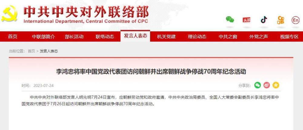 中联部:李鸿忠将率党政代表团访朝并出席朝鲜战争停战70周年纪念活动