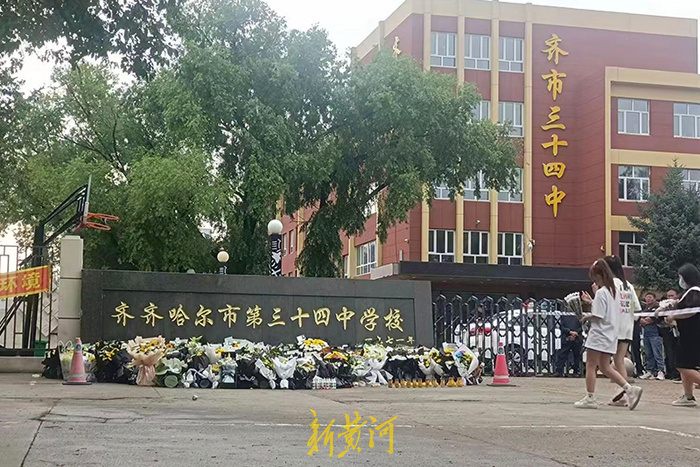 24日下午5时许,新黄河记者在三十四中学门前看到,不少市民专程赶来献花悼念,同时记者也注意到,还有不少外卖骑手将花束摆在校门前。
