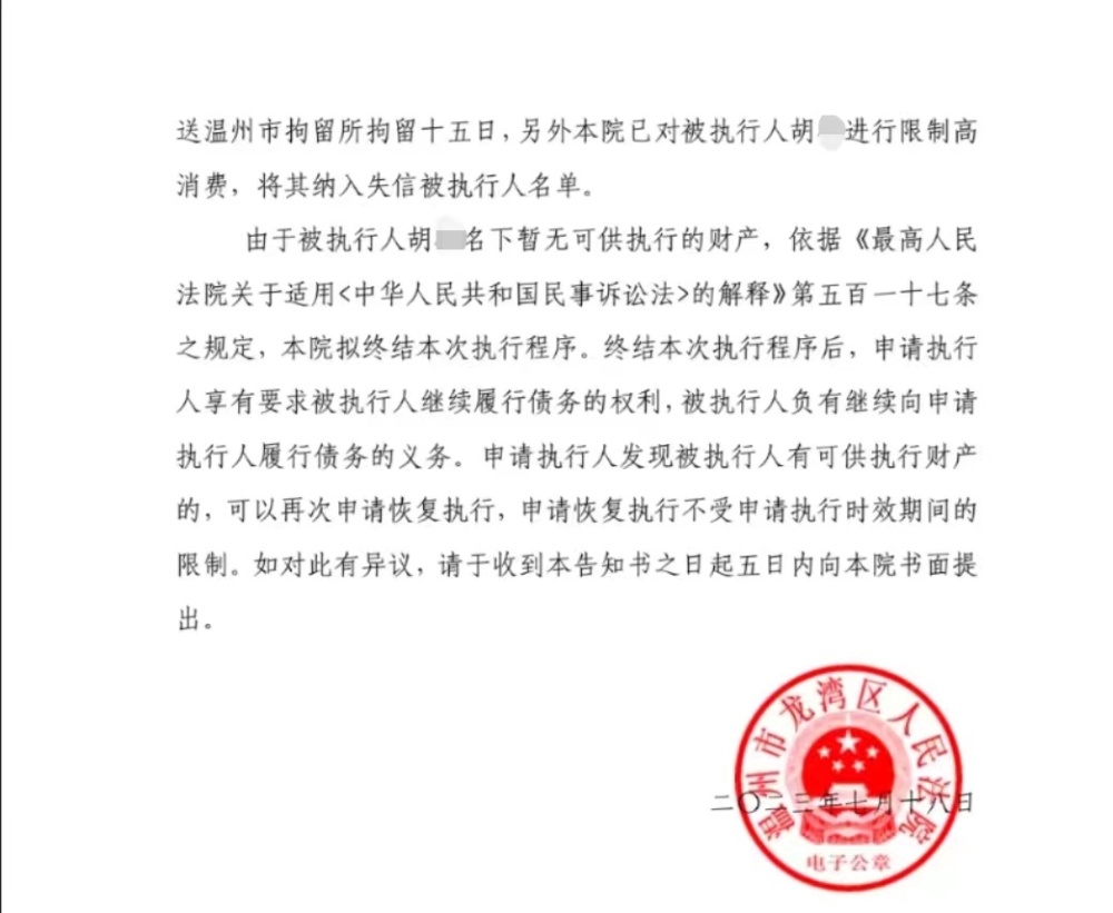 7月24日,记者联系温州市龙湾区法院执行法官证实,胡某被列为被执行人,但执行案件已终止。