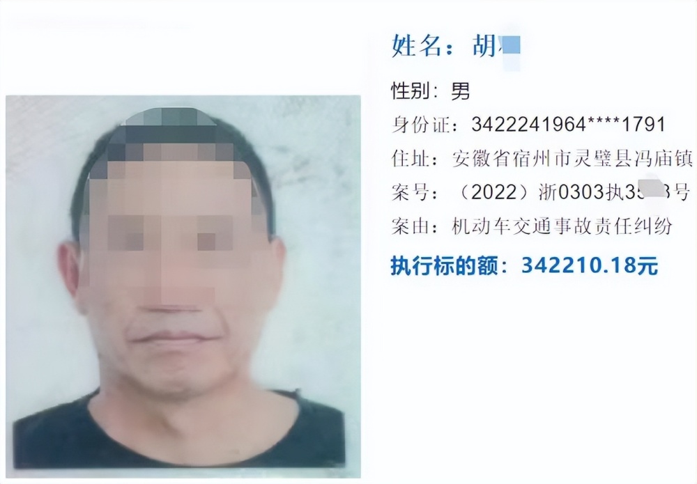 温州市龙湾区法院公布的2023年第一期失信被执行人中,59岁胡某因机动车交通事故责任纠纷被法院公开曝光,公布信息显示,胡某被执行标的额为342210.18元。