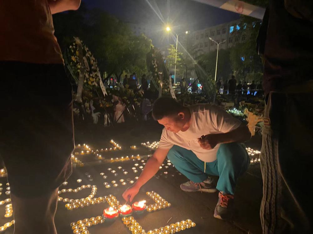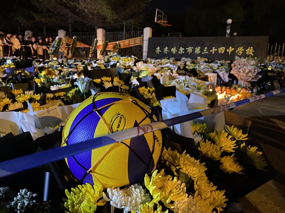 事故发生后,许多市民来到校门口悼念,捧一束白菊,或者再点亮一团新的烛光。簇拥的花束中,放了好几个全新的排球,还有曾与队员们交手的排球俱乐部送来的旗徽。