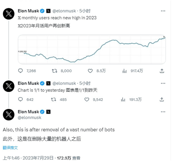 马斯克还强调,这是在删除了大量机器人之后的数据,说明真人活跃度是大大提升的。