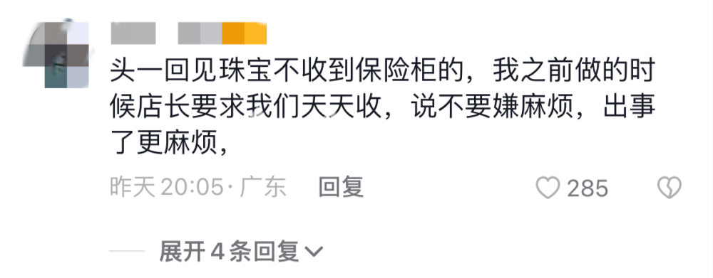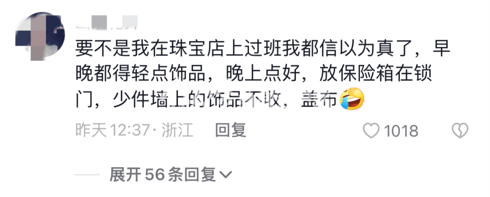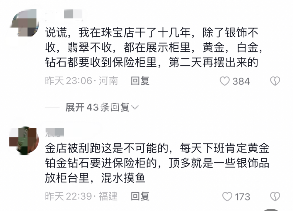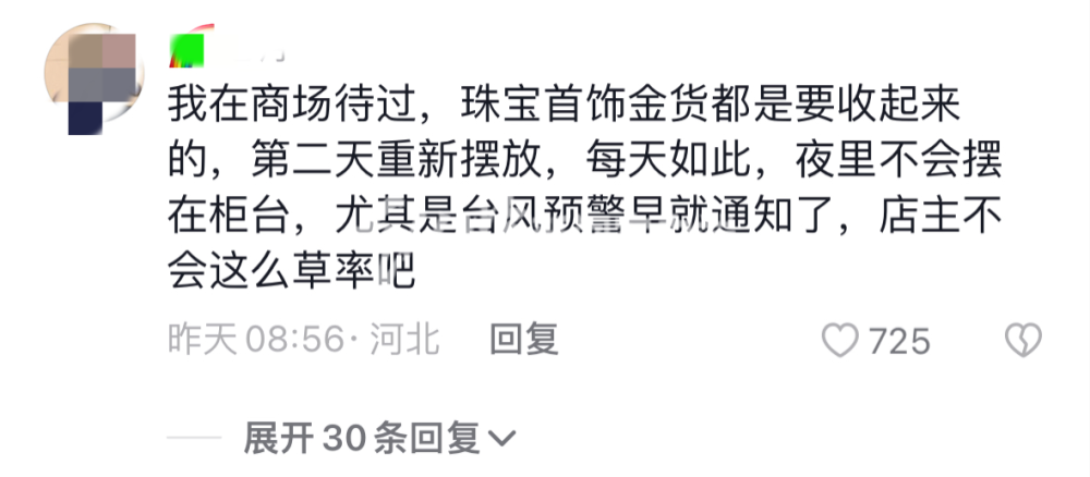 纵览新闻记者注意到,网上有网友在为这家珠宝店损失惨重表示惋惜,也有不少网友对店方至少损失500万的说法表示质疑。有部分自称是珠宝行业从业者的网友称,珠宝店每天闭店都会进行盘点,盘点过后会将珠宝放进保险柜内,不应该发生珠宝被冲走的情况。另外,明知有台风,怎么不提前将珠宝收到保险柜。“说谎,我在珠宝店干了十几年,除了银饰不收,翡翠不收,都在展示柜里,黄金,白金、钻石都要收到保险柜里,第二天再摆出来的。”有网友直接表示店主说谎。还有网友甚至怀疑店方有“骗保”嫌疑。也有网友认为,这家珠宝店可能是个体经营,因为柜台本身就有锁,不会每天收起来再摆出来,另外也没有预判到台风做足防范,才有可能发生如此大的损失。在社交平台,还有媒体发布了有好心人来归还捡到该珠宝店金饰的视频。