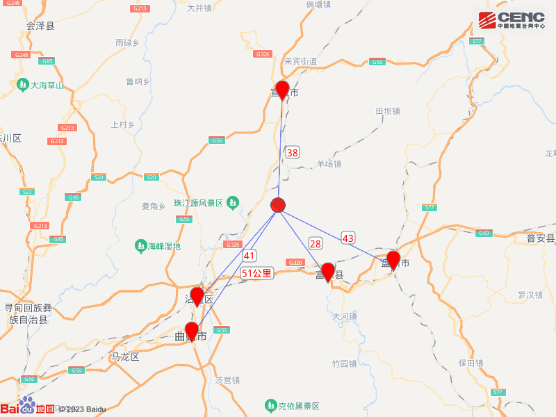 震中距富源县28公里、距宣威市38公里、距沾益区41公里、距贵州盘州市43公里、距麒麟区51公里,距曲靖市52公里,距昆明市167公里。