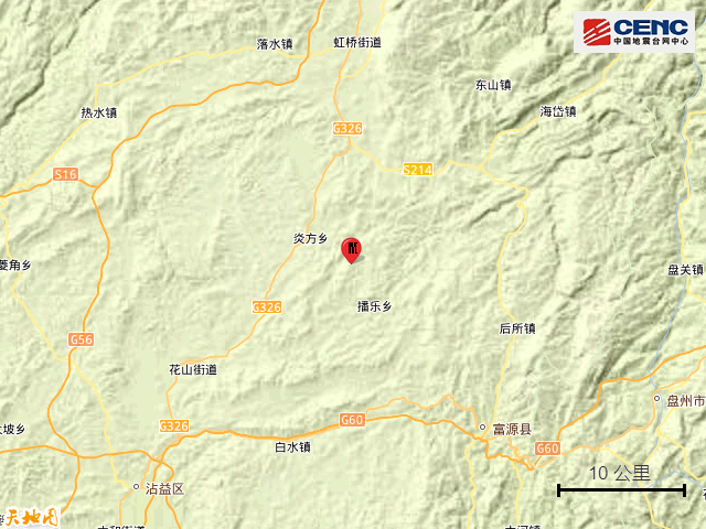 本次地震周边5公里内的村庄有豹子槛、被卡、鸭团村、老撇坡、鲁海、张发村、团山村、上庄子、麦地北村、小口子,20公里内的乡镇有炎方乡、播乐乡。