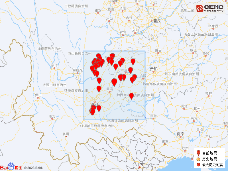 根据中国地震台网速报目录,震中周边200公里内近5年来发生3级以上地震共52次,最大地震分别是2020年5月18日在云南昭通市巧家县发生的5.0级地震(距离本次震中172公里)和2018年8月14日在云南玉溪市通海县发生的5.0级地震(距离本次震中234公里),按震级大小前50次历史地震分布如图。