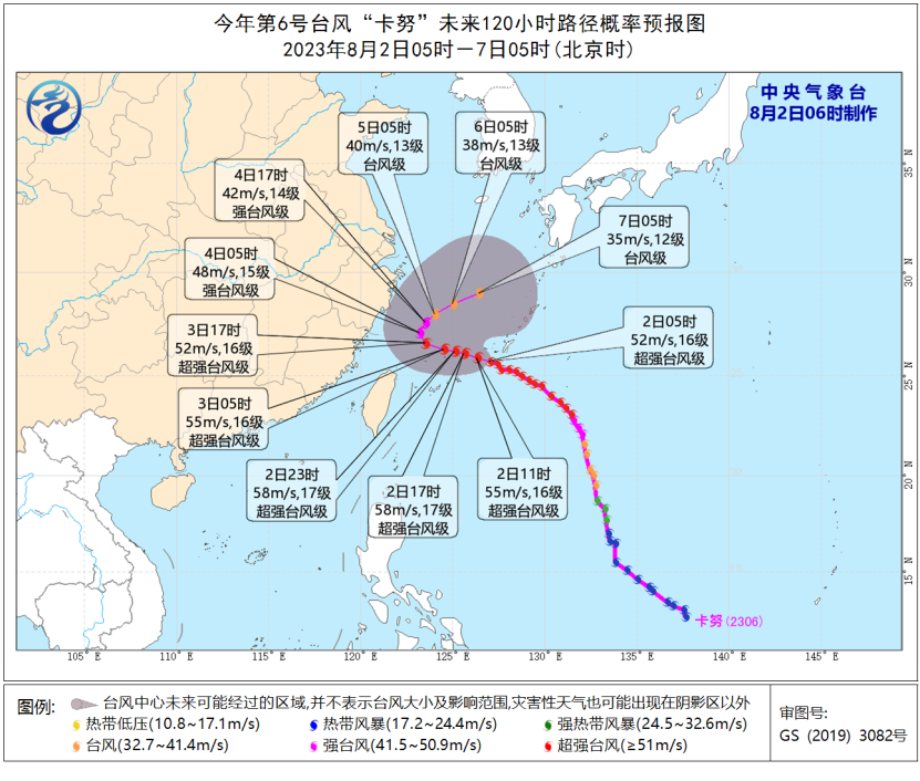 大风预报:8月2日08时至3日08时,巴士海峡、台湾以东洋面、东海大部及钓鱼岛附近海域以及杭州湾、浙江沿海、福建北部沿海、台湾岛北部和南部沿海将有6-8级、阵风9-10级的大风,其中东海南部海域风力可达9-12级、阵风13-14级,“卡努”中心经过的附近海面的风力有13-17级、阵风17级以上。