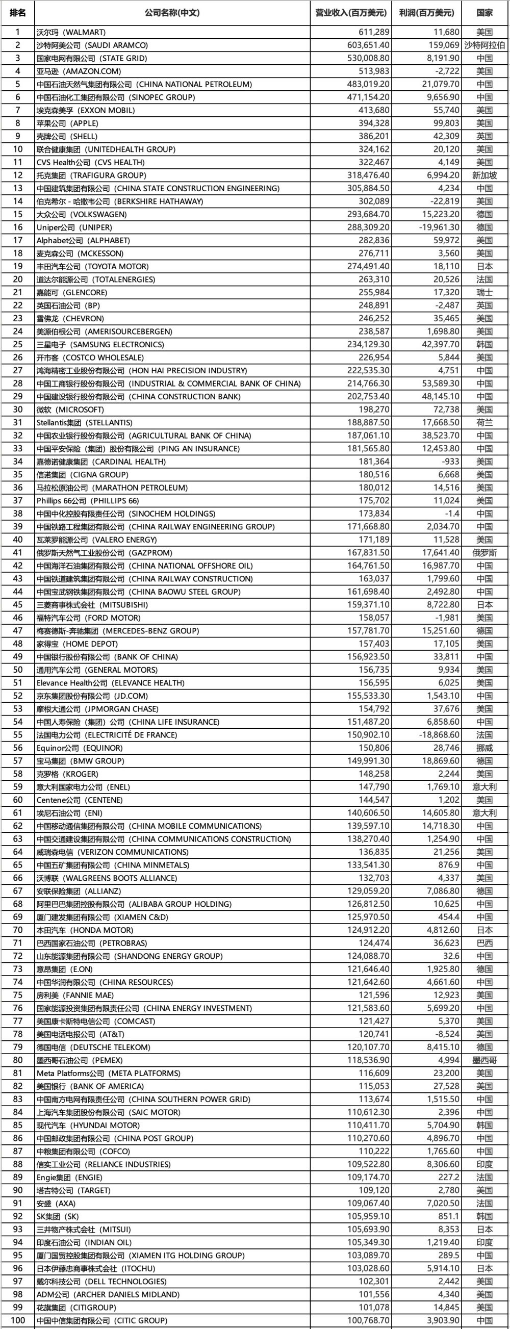 沃尔玛连续第十年成为全球最大公司。沙特阿美首次上升至第二位。中国的国家电网公司继续位列第三。排在第四和第五位的分别是亚马逊和中国石油。