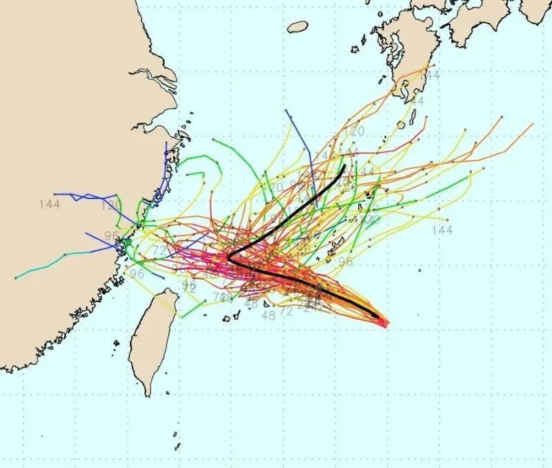 从图中可以看到,数值预报模式认为“卡努”未来有可能的行进路径非常之多。上海中心气象台也认为,“卡努”未来的路径复杂多样。