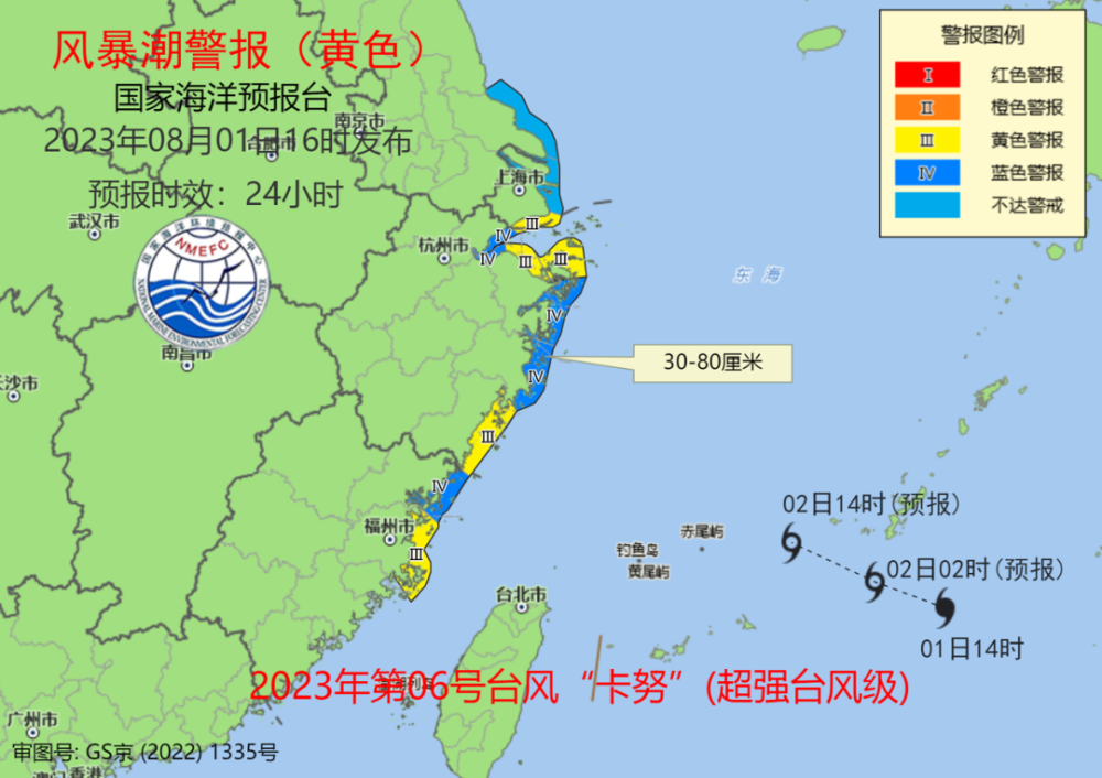 国家海洋预报台同时拉响风暴潮黄色警报。预计8月1日下午至2日夜间,江苏南通到福建福州沿海将出现30到80厘米的风暴增水。上海市、浙江省宁波市、舟山市、温州市和福建省福州市的风暴潮预警级别为黄色。浙江省嘉兴市、绍兴市、台州市和福建省宁德市的风暴潮预警级别为蓝色。由于受台风影响岸段的天文潮较高,需要重点关注夜间沿海的天文大潮时段,且台风路径尚有不确定性,国家海洋预报台将密切关注,同时提醒沿海政府及相关部门按照职责做好防御风暴潮的应急准备工作。