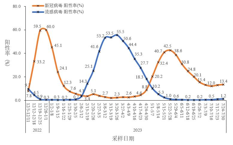 流感样病例新冠病毒阳性率从第21周(5月22日-5月28日)的42.5%持续下降,第28周(7月10日-7月16日)下降至12.0%后开始略有上升,第30周(7月24日-7月30日)上升至13.4%。见图3-2。