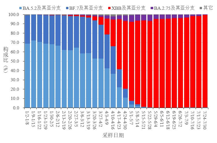 根据采样日期,XBB及其亚分支的占比逐渐增加,从2023年第27周(7月3日-7月9日)的96.3%,增长到第30周(7月24日-7月30日)的99.1%。见图4。