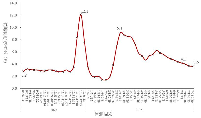 全国哨点医院流感样病例占门(急)诊就诊人数比例从2023年第27周(7月3日-7月9日)的4.1%持续下降至第30周(7月24日-7月30日)的3.6%。见图3-1。