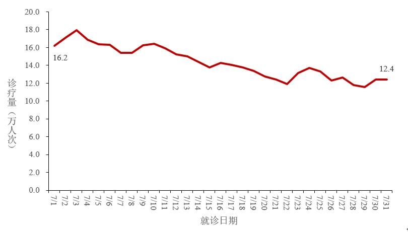 全国31个省(自治区、直辖市)及新疆生产建设兵团发热门诊(诊室)诊疗量从2023年7月1日的16.2万波动下降至7月31日的12.4万。见图2。