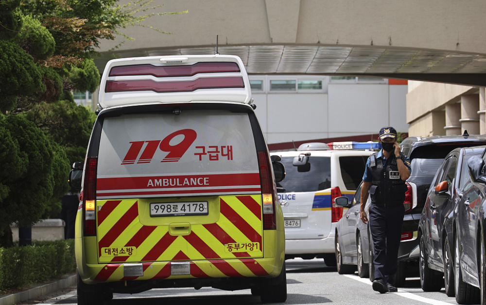 当地时间2023年8月4日,韩国大田市,一所高中发生持刀伤人事件,救护车在等待受伤人员。