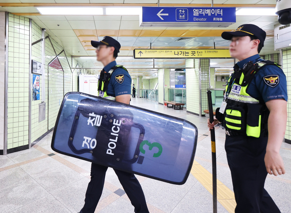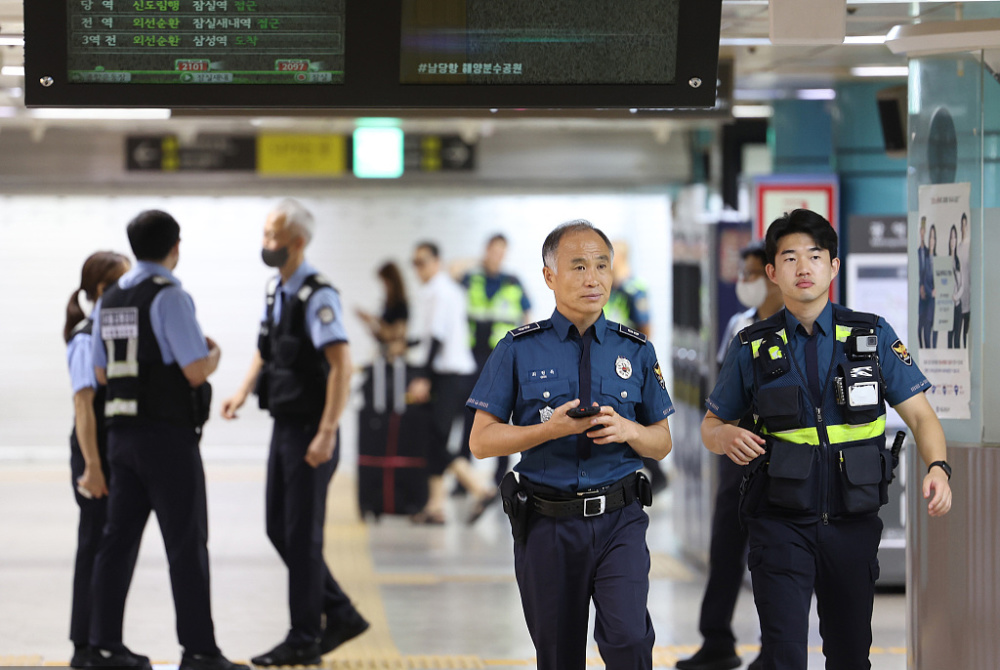 当地时间2023年8月4日,韩国城南市,警察在西岘地铁站加强巡逻。
